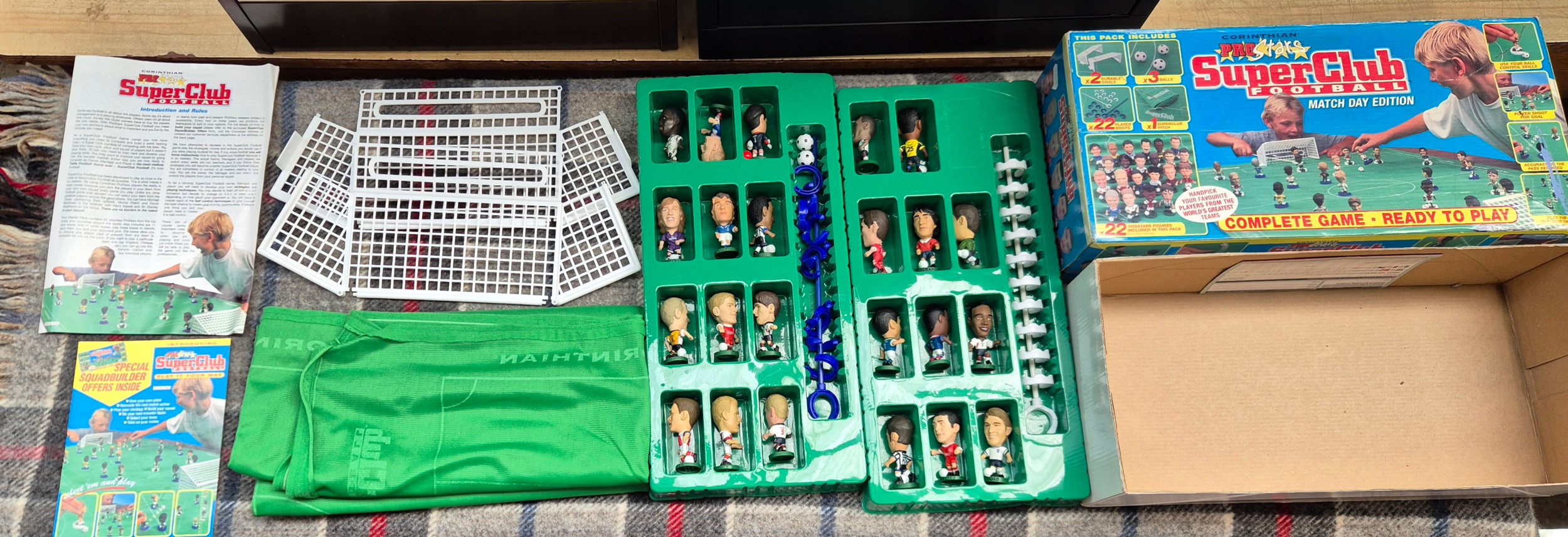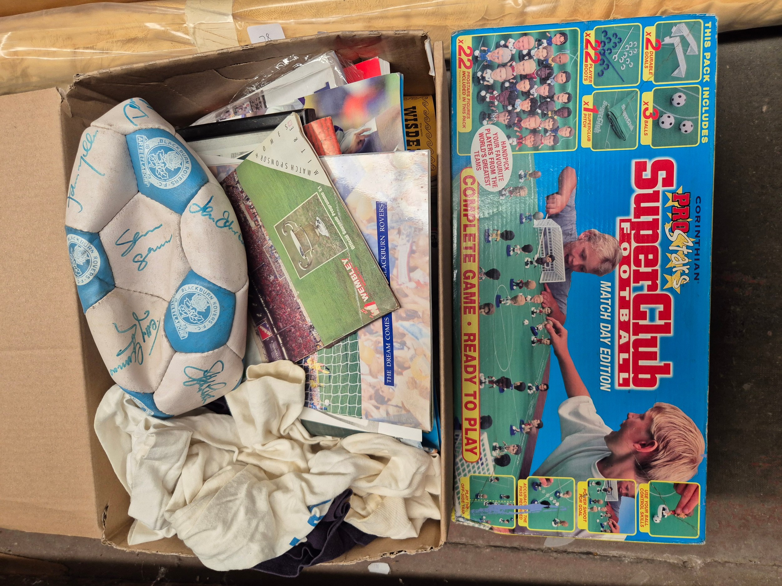 A box of football memorabilia including a signed ball, Blackburn Rovers, games etc. etc.