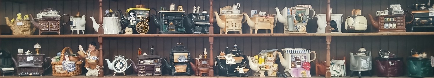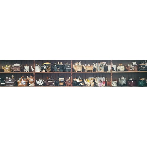 4 teapots showing signs of crazing (1 internal, 3 external). 2 have loose objects. One may have had objects glued back in wrong place. The mangle has some scratches to the underside of the spout. The Ringtons man with the basket has a number of areas where the coloured, glazed areas have flaked off. These are mainly to the rear and the side. The cats on top of the piano are stuck on with double sided stickers. Inside one of the teapots is a model of a packet of Ringtons Tea. It does not appear to have broken off any of the teapots in this collection. Most are standard size, but one or two are slightly smaller. One is definitely a mini teapot