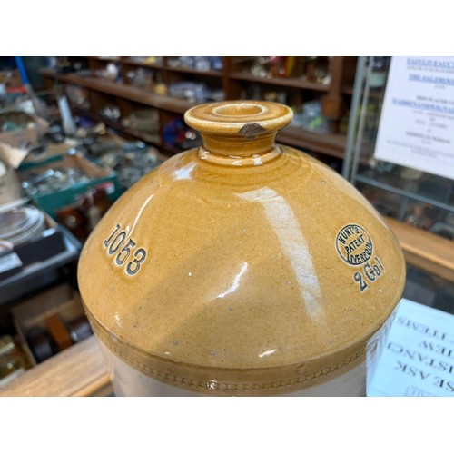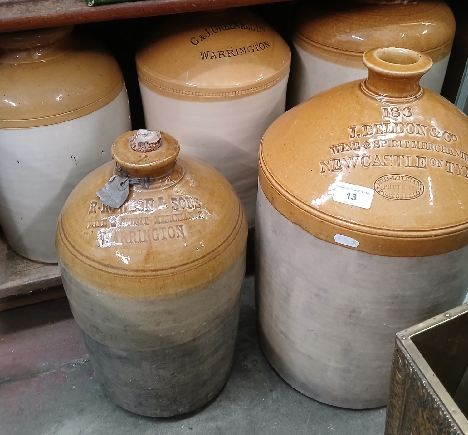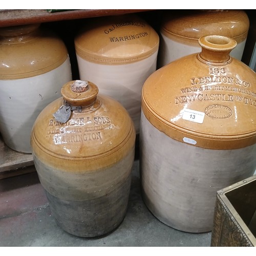 Five stoneware flagons including Newcastle, Greenalls, Warrington.