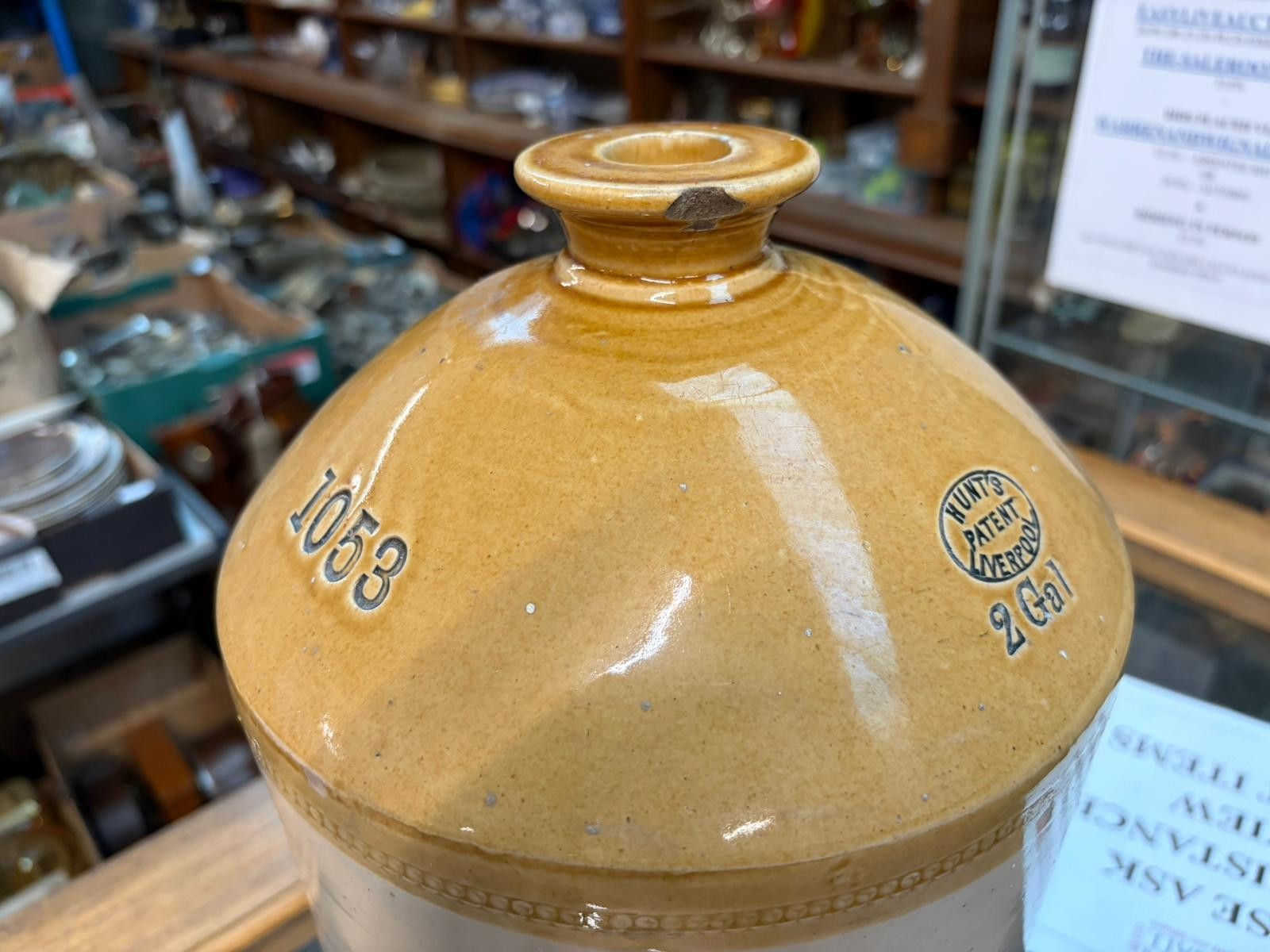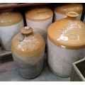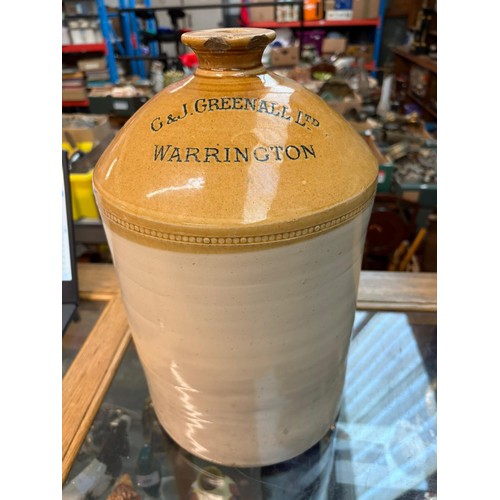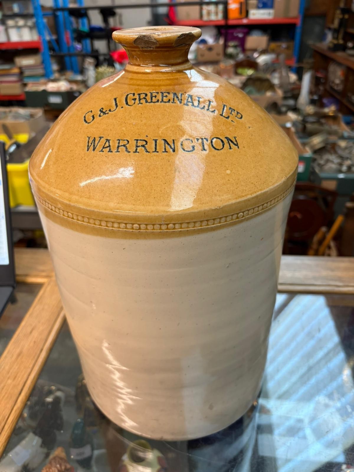 Three chips to the rim of the neck of the Greenalls flagon. no other damage. Rowson, Warrington has a number of cracks and holes near the base but these do not appear to affect the integrity of the flagon. The smaller flagon, marked Bourne, Denby, has a vertical hairline crack approx 6 inches length and one or two indentations, possibly from manufacturing process. The Doulton Lambeth flagon has a number of red paint splashes. Newcastle flagon (Midlothian Pottery made) has general wear only.