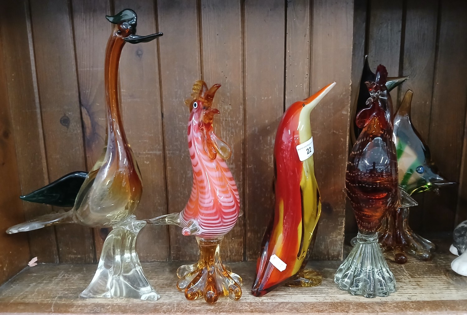 Peacock has a chip to the rear tips of the base. The tip of the last feather of the dark red cockerel's comb is broken off . The fish has a chip to the dorsal fin appx 3mm square. Penguin is in good condition. The pink cockerel has a number of vertical lines in the glass where the pedestal joins the body of the bird