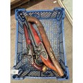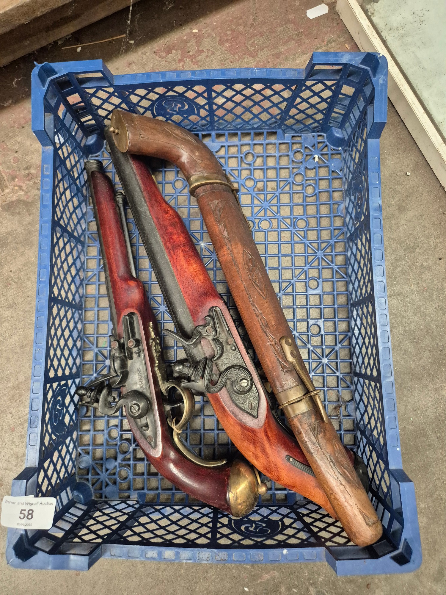 Two reproduction pistols and an Indian carving knife in wooden sheath.