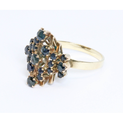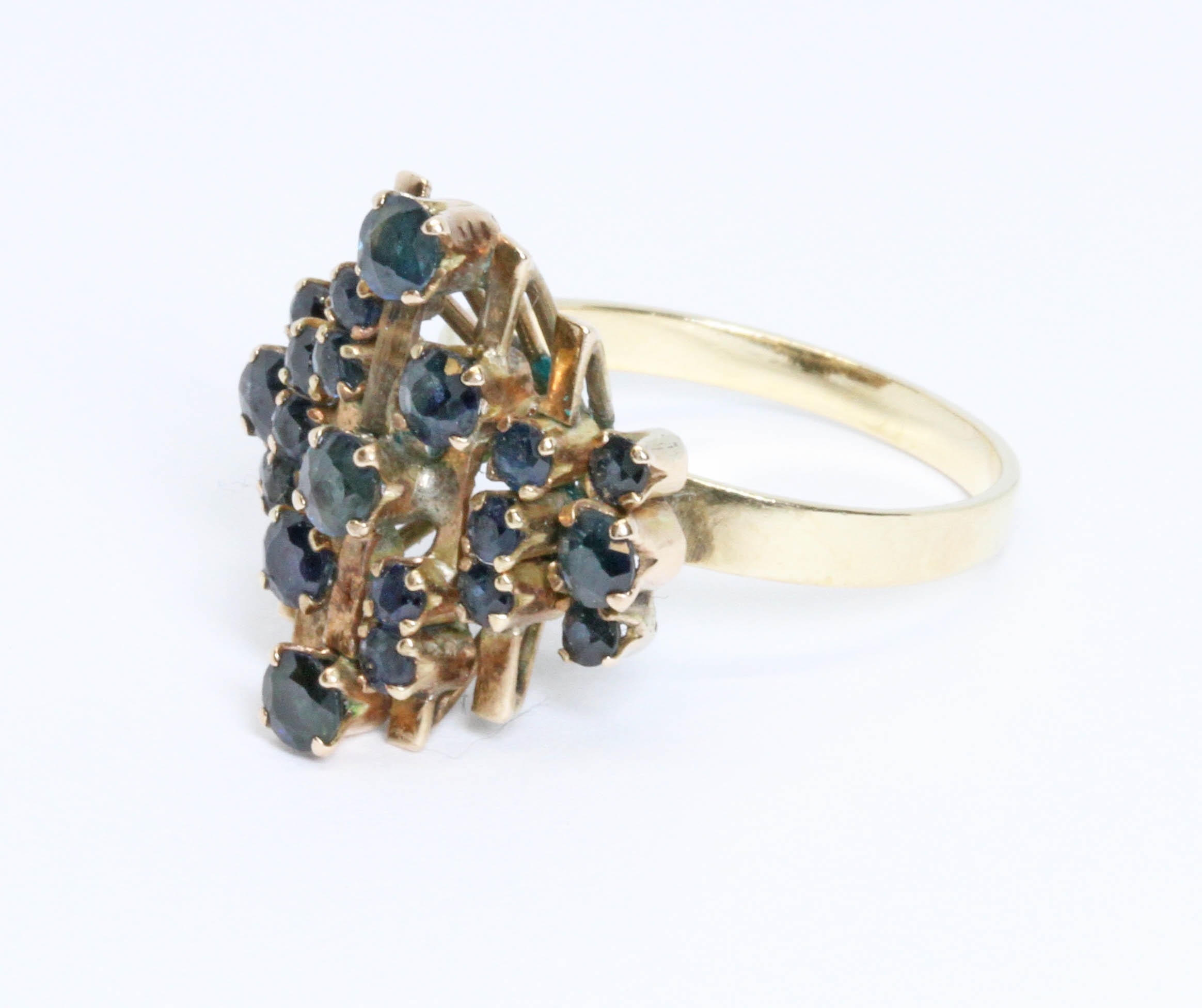 A sapphire cluster ring, yellow metal unmarked, gross weight 4.2g, size O.