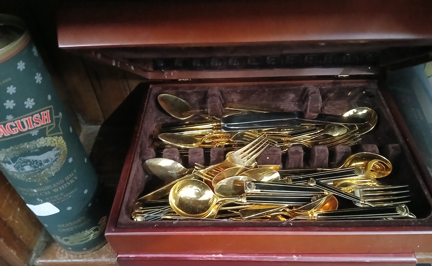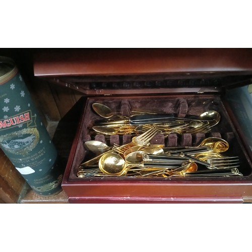 Two canteens of cutlery and a bottle of Drumguish whisky