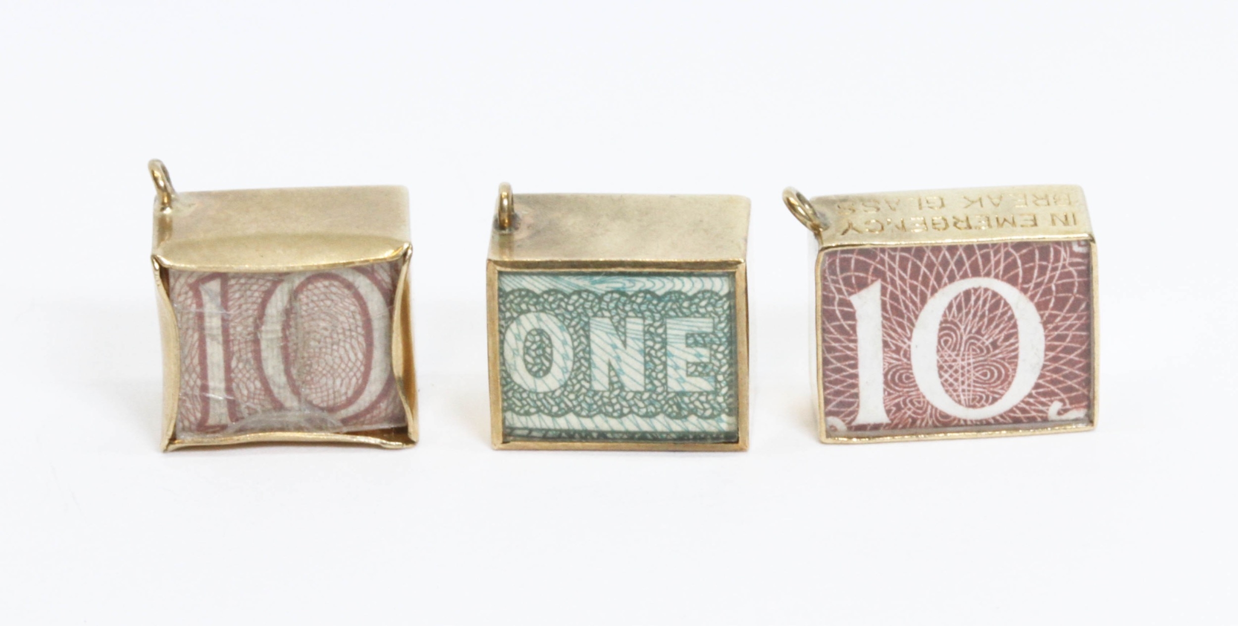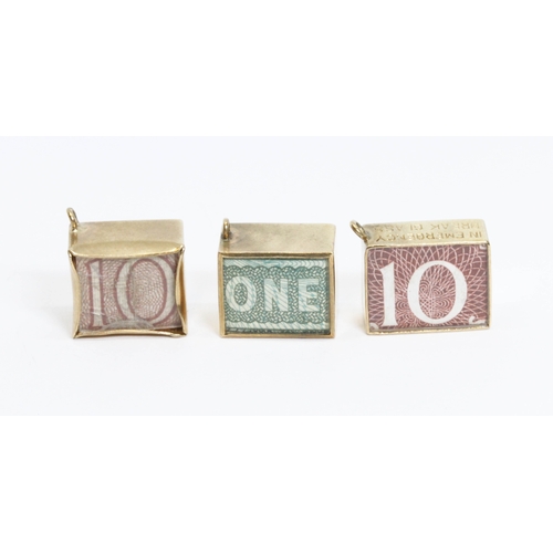 A group of three hallmarked 9ct gold bank note charms, gross weight 8g.