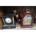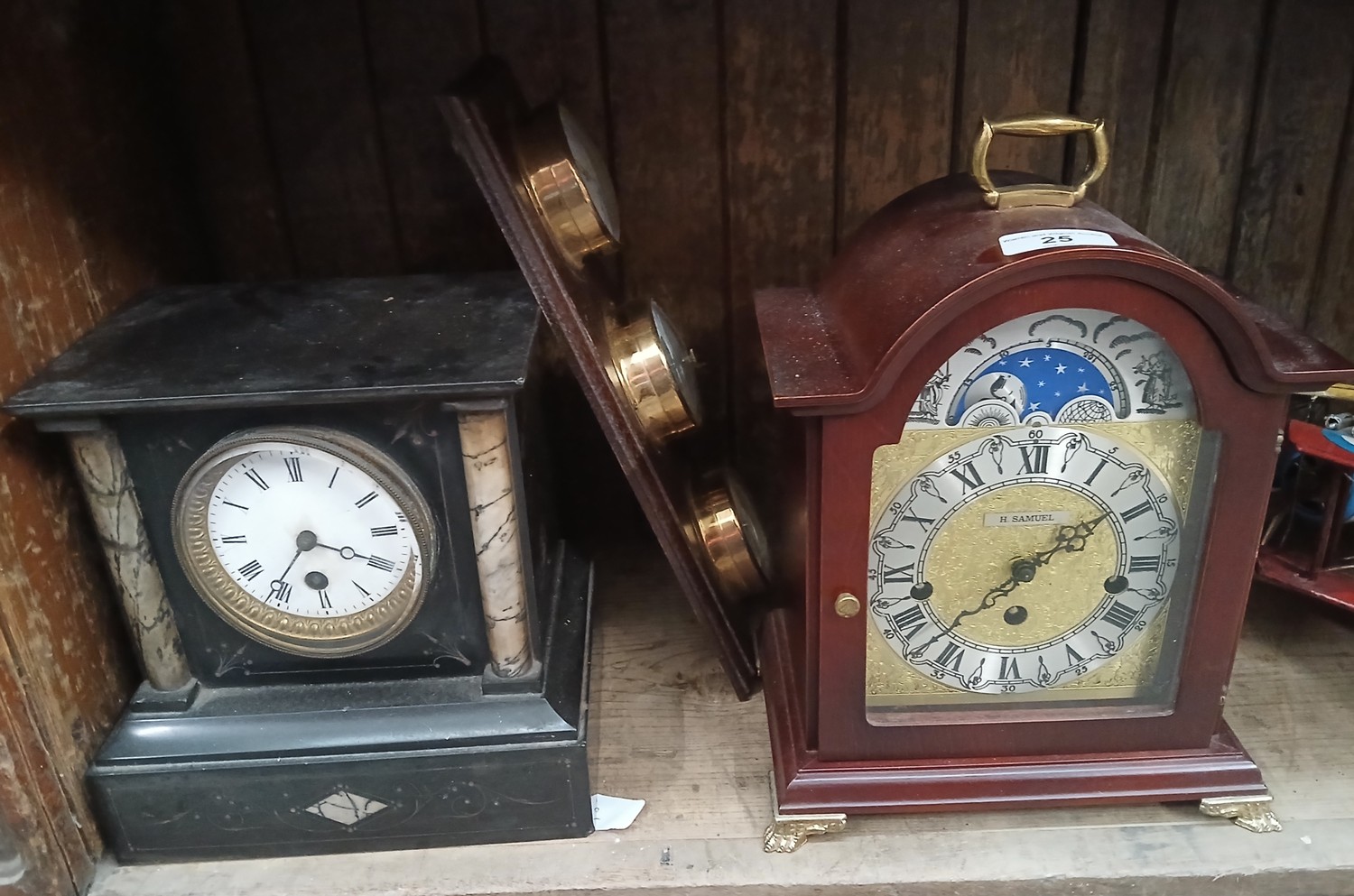 A black slate clock, modern rolling moon mantle clock and a barometer.