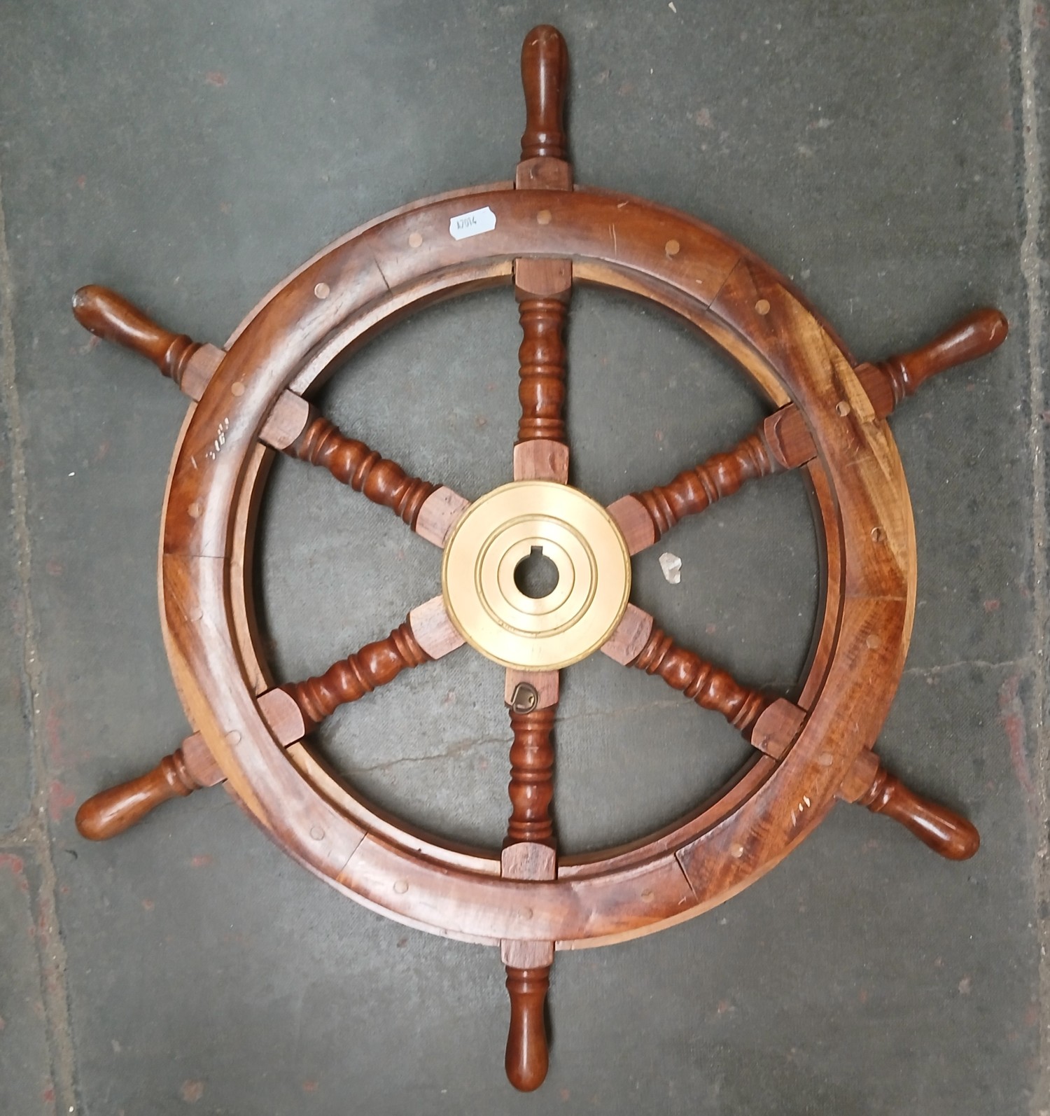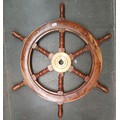 A teak and brass ship's wheel.