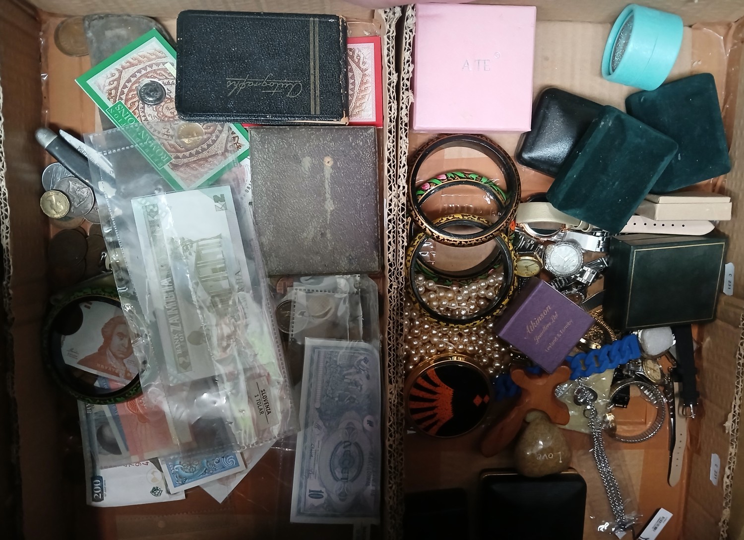 Two boxes of collectables, watches, costume jewellery, foreign bank notes and coins etc