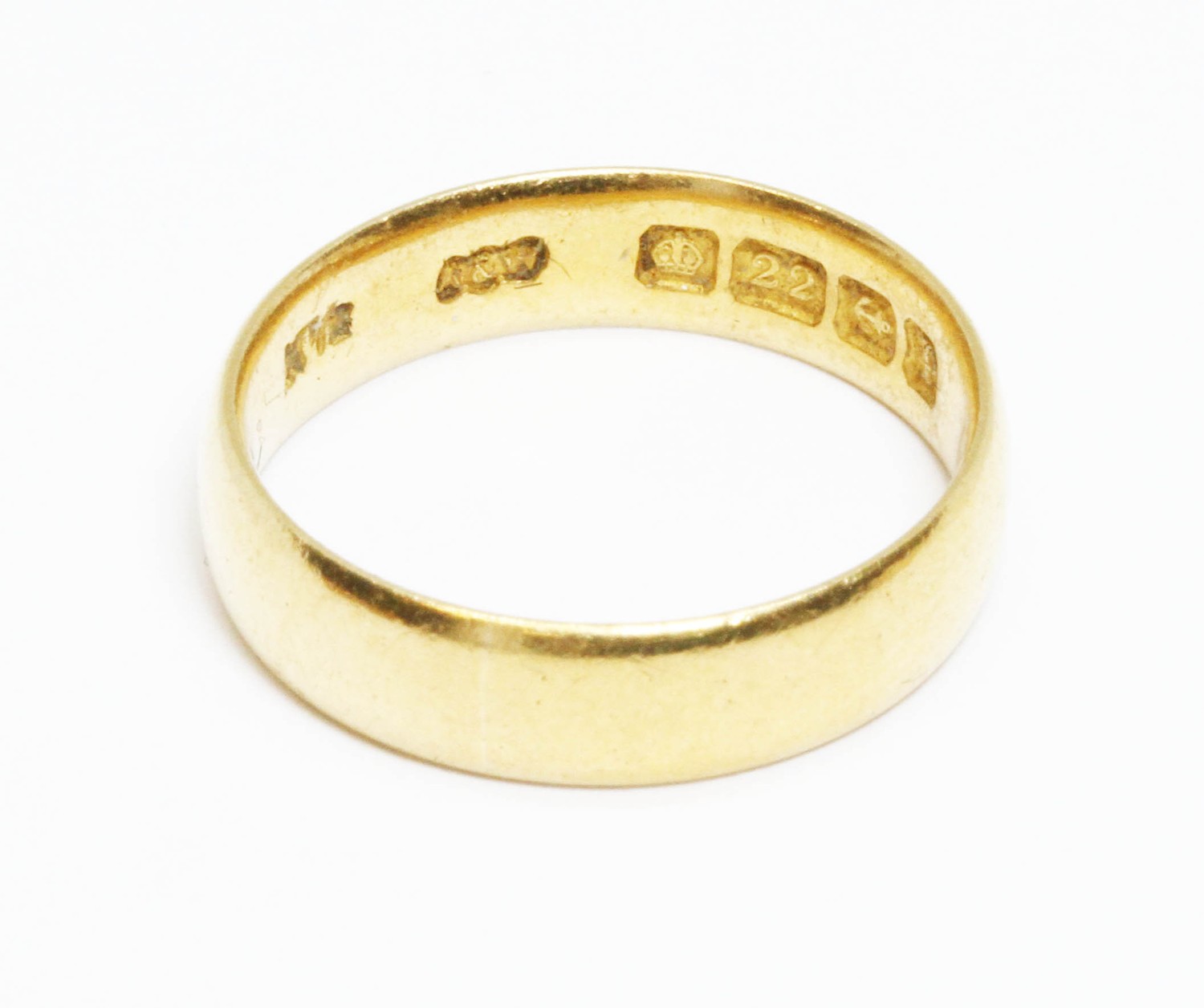 A 22ct gold wedding band, sponsor 'A&W', Birmingham 1939, weight 4.2g, size K, depth 1.30mm, width 4.50mm.
