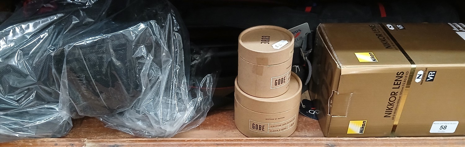 A Nikon Nikkor 105 lens with box and soft case, together with a Benbo tripod and two Gobe lens filter kits.