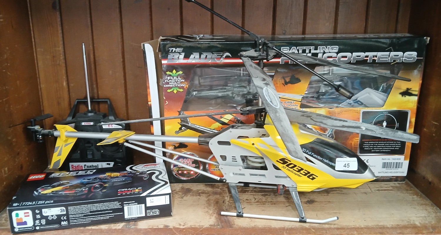 Two model helicopters and a Lego Speedmasters set.