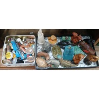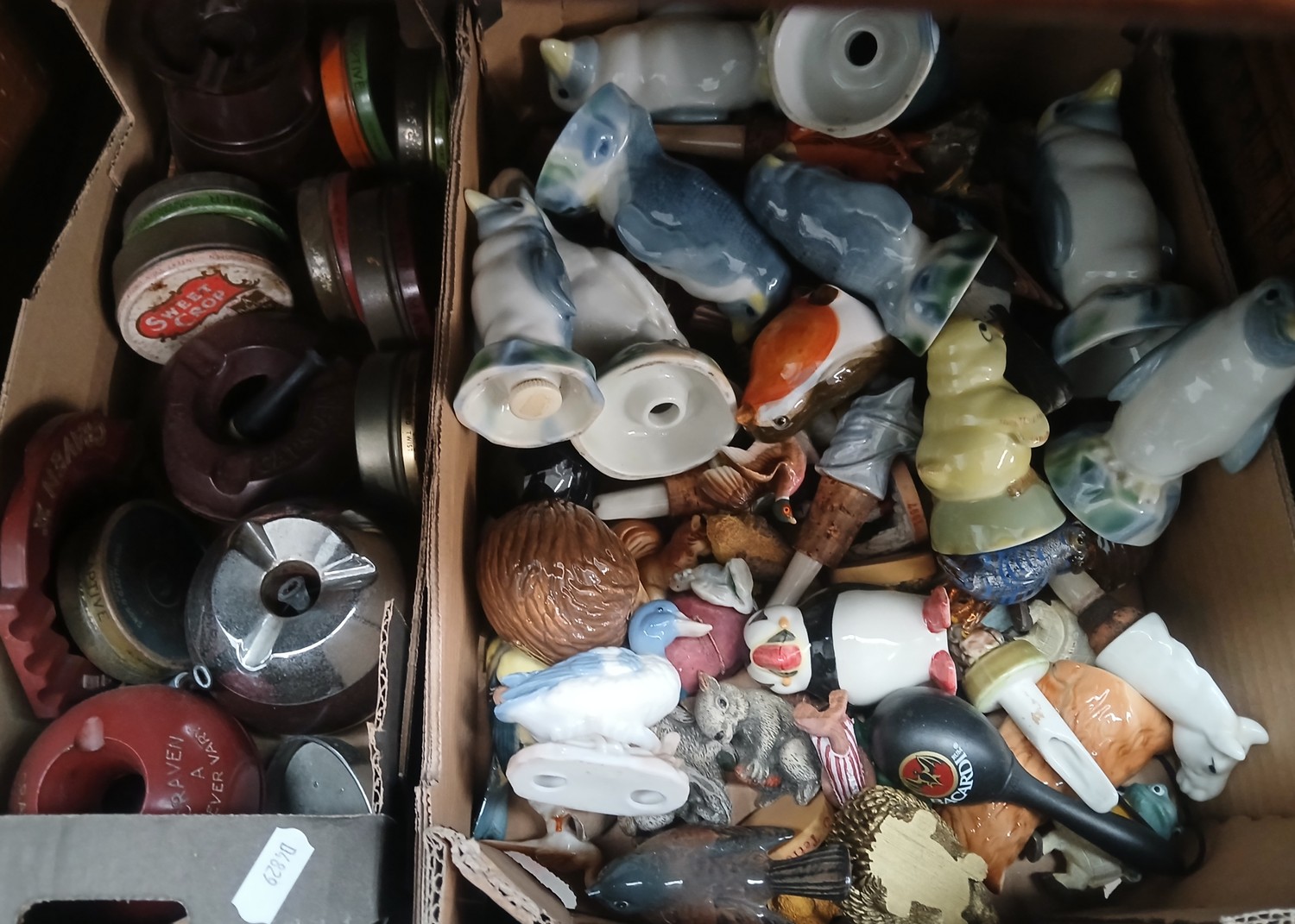 Two boxes of breweriana including stoppers, ceramics novelty miniatures, ash trays etc.