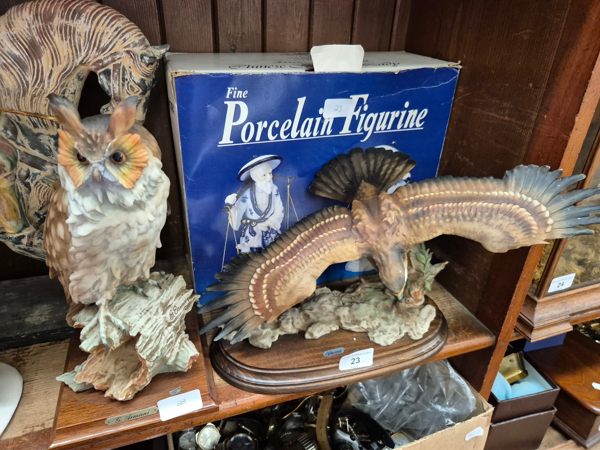 Porcelain figurine of a Chinese woman and man together with two G. Armane porcelain figurines of an owl and an egal