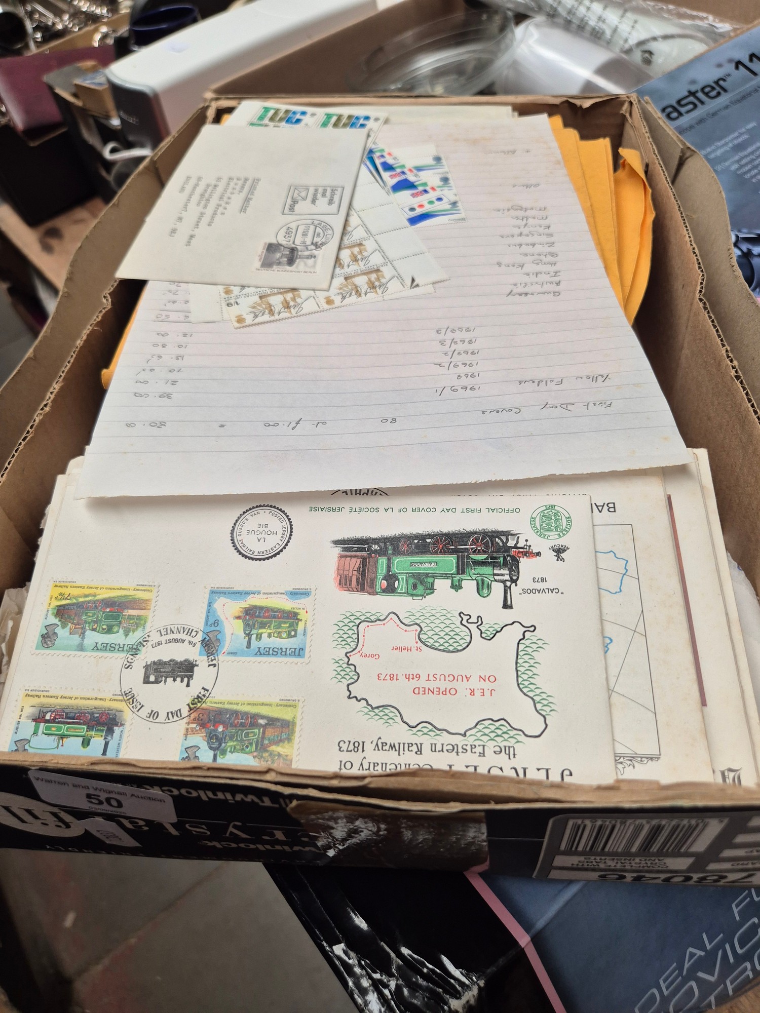 A box of stamp albums, stamps and first day covers ets
