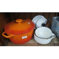 Two Le Cruset pans and a similar volcano orange cooking pot.