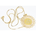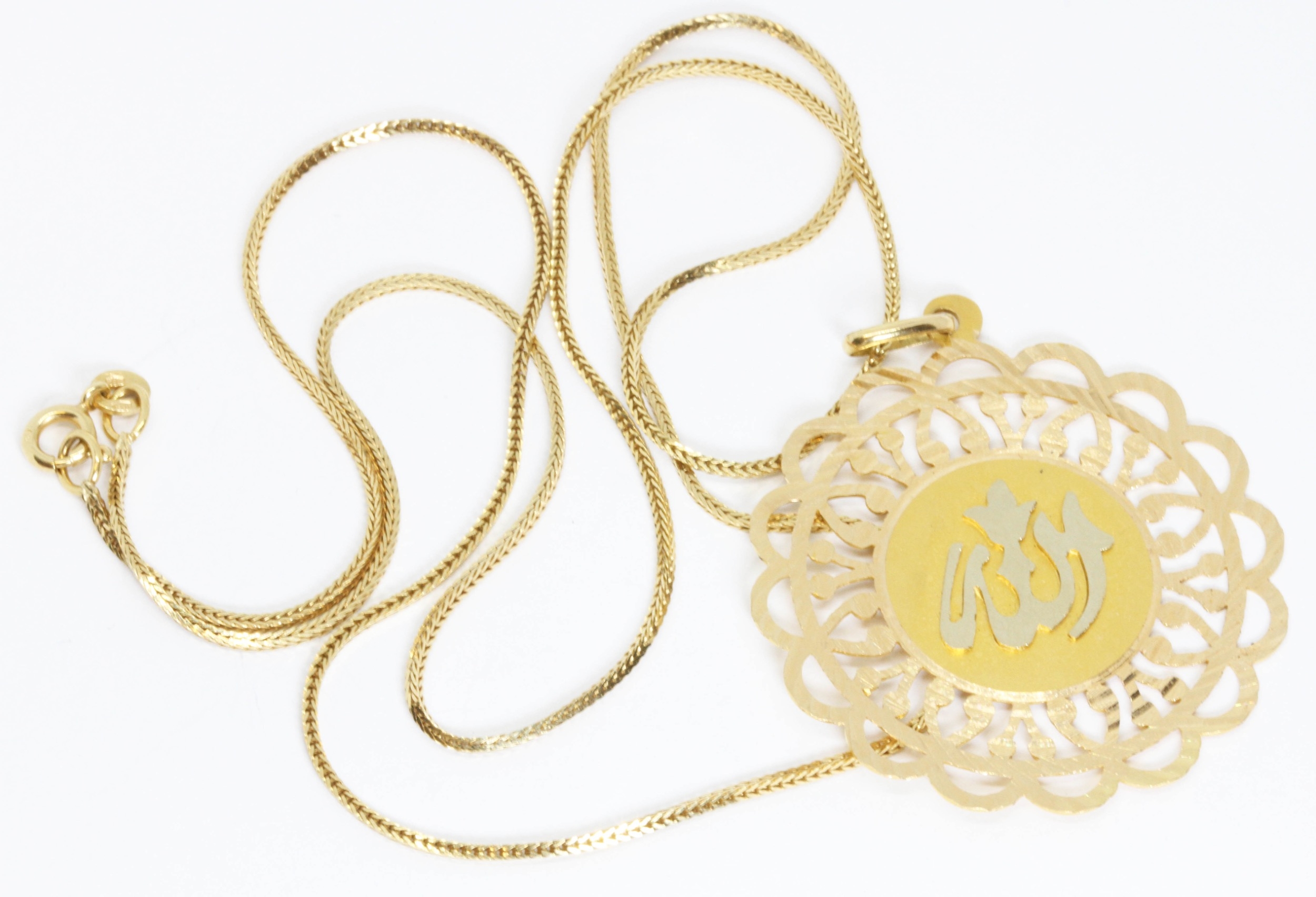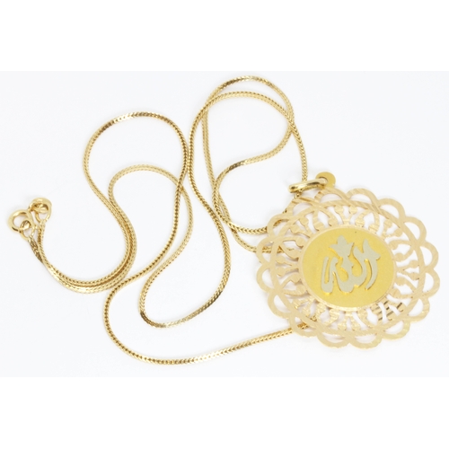 A pierced pendant with Arabic script, on 56cm snake link chain, both marked '750', gross weight 13.5g.