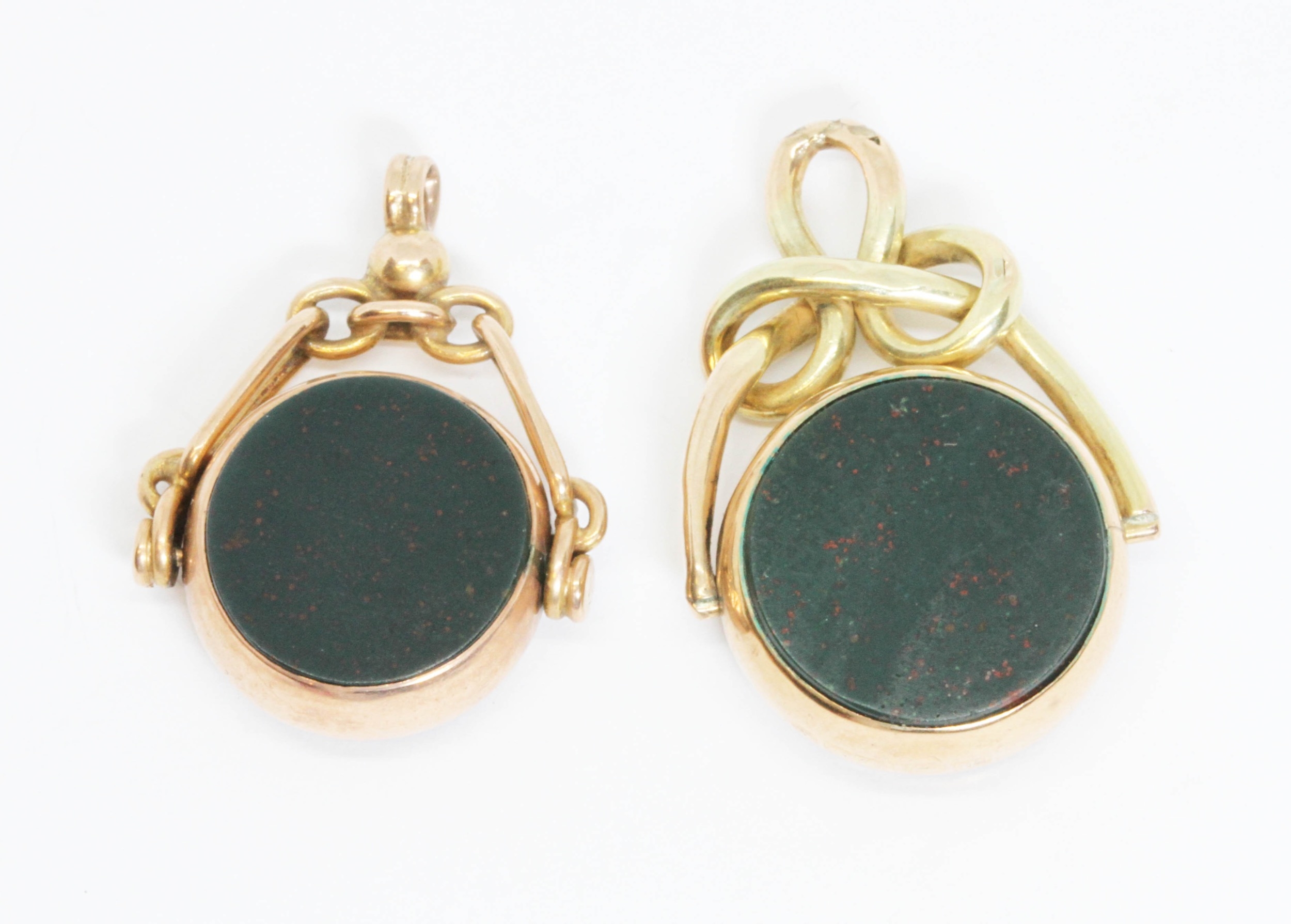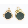 Two hallmarked 9ct gold moss agate and chalcedony swivel fobs, gross weight 11.6g.