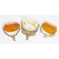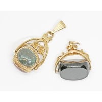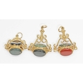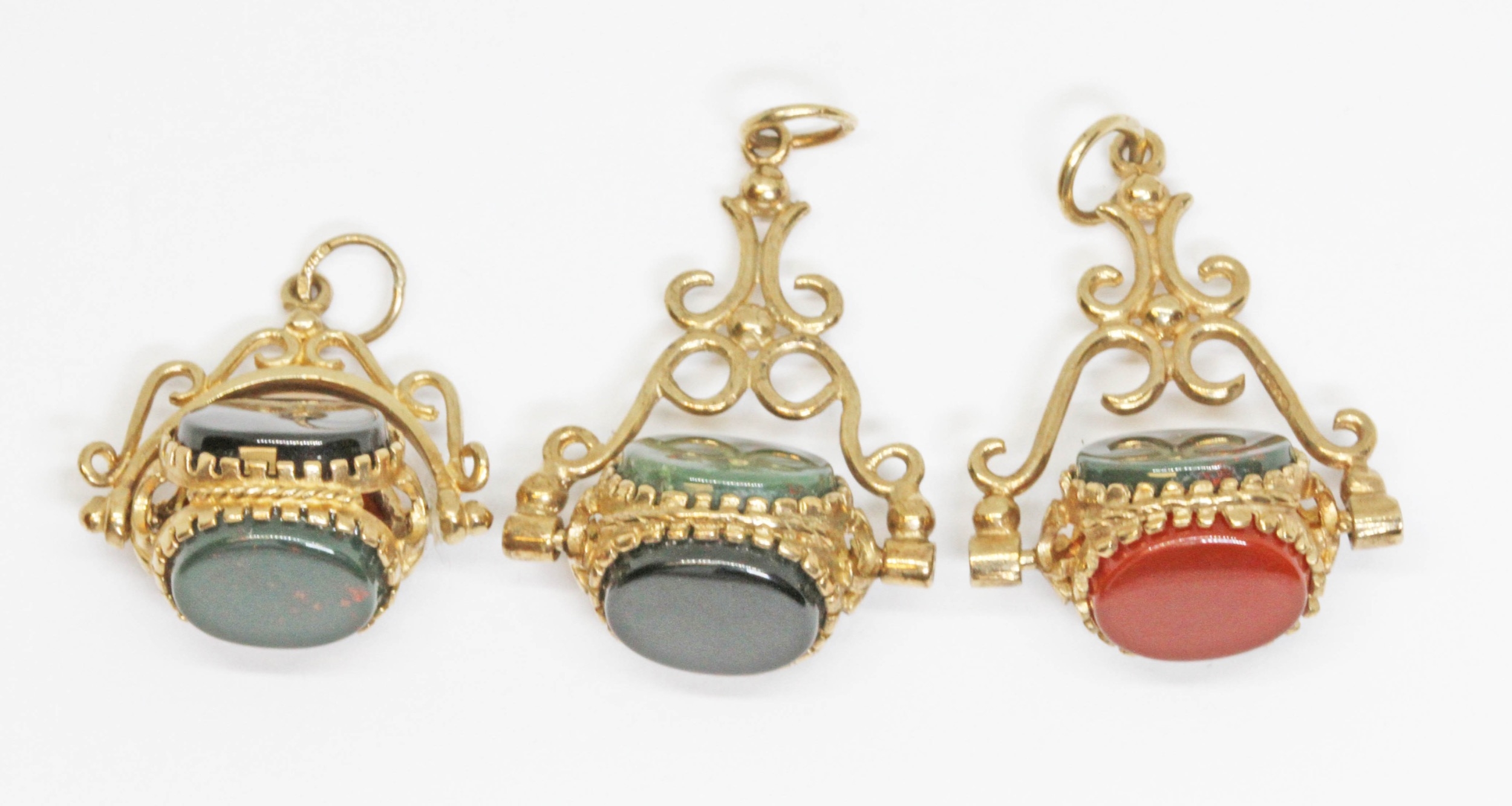 A group of three hallmarked 9ct gold quartz variety swivel fobs, gross weight 8.8g.