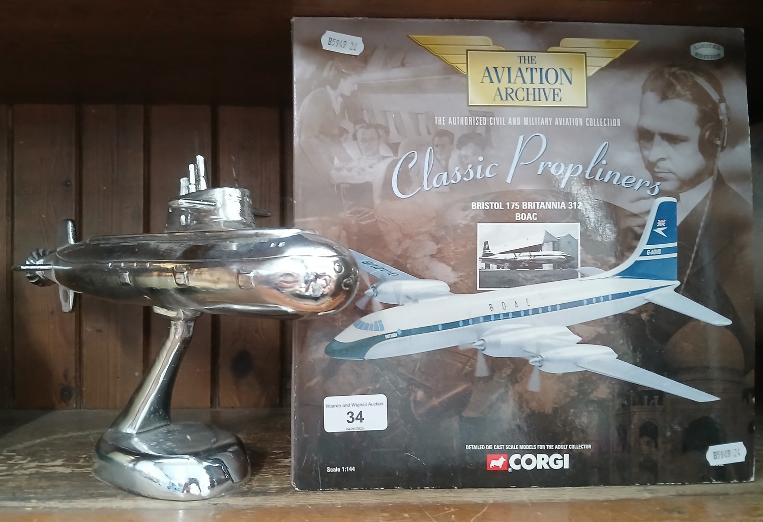 A Corgi 'Classic Propliners' model aircraft- Bristol 175 Britannia 312 BOAC together with a desktop model of a US submarine.