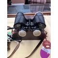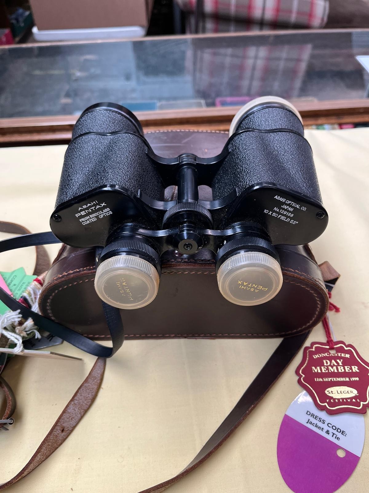 A pair of Asahi Pentax 10 x 50 binoculars in a cow hide case