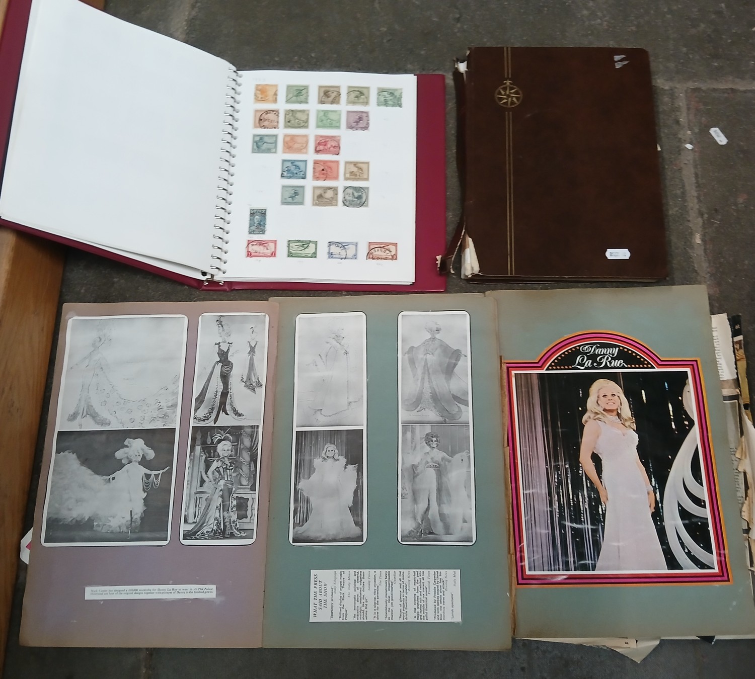 Two scrap books with photographs and newspaper articles, show tickets for Danny La Rue including autographed examples, together with two stamp albums.