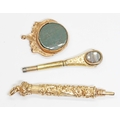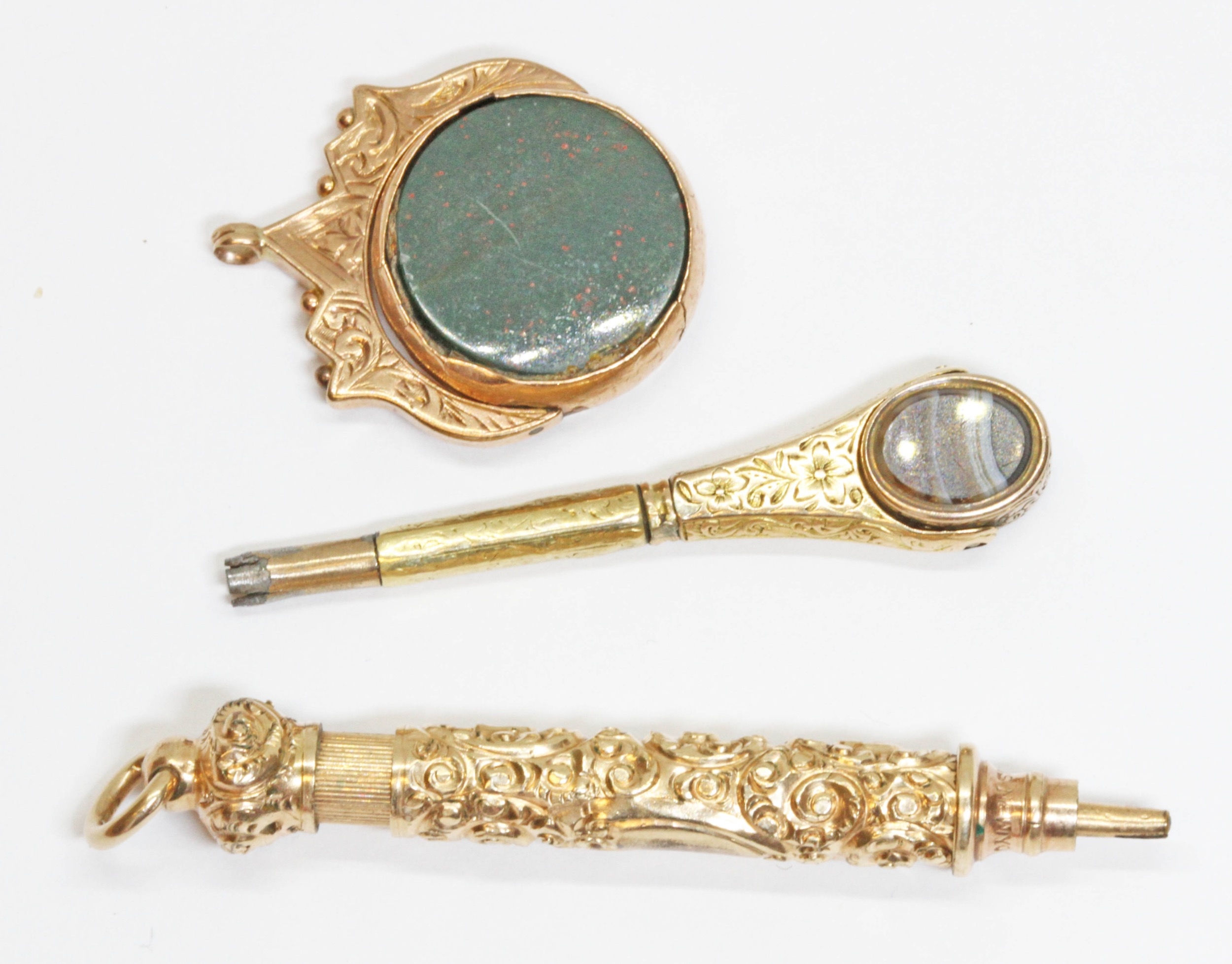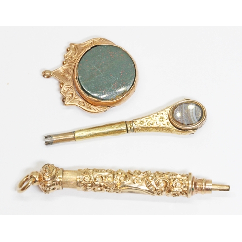 A mixed lot comprising a gold plated propelling pencil marked 'W.S. Hicks New York', a yellow metal watch key with swivel fob and a hallmarked 9ct gold mounted swivel fob, all as found.