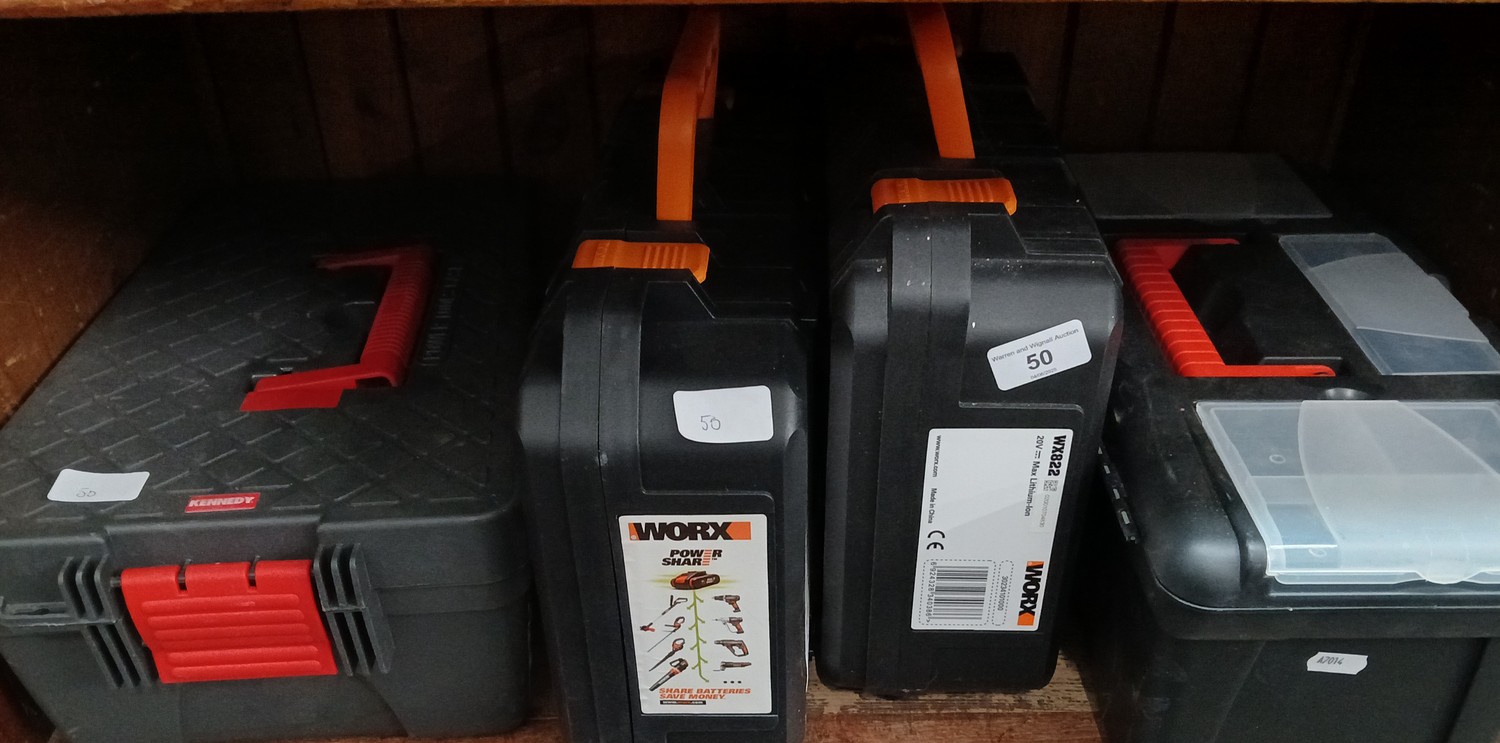 A Worx "Chopper", a Worx 20volt Cordless Jigsaw, (no battery but has a charger unit, a Tacklife Corded impact Drill in a case, and a toolbox of bicycle parts.
