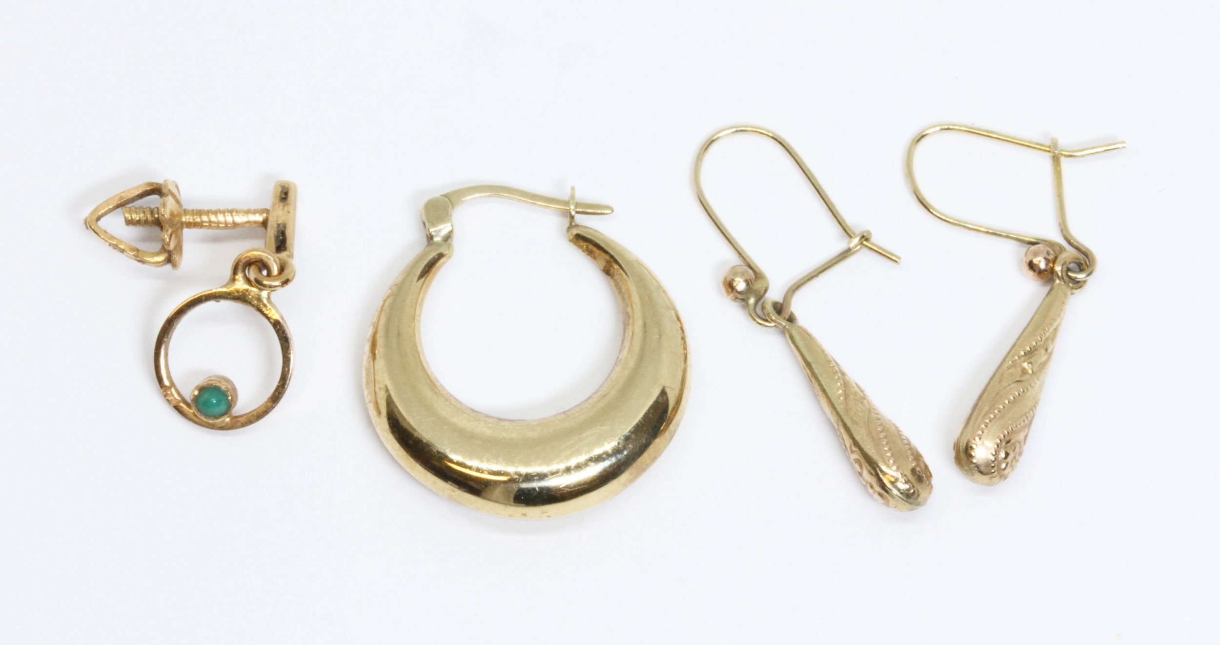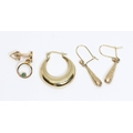 A mixed lot comprising a pair of earrings indistinctly marked, an odd earring with turquoise cabochon and with Egyptian marks, and an odd hoop earring marked '375', gross weight 3g.
