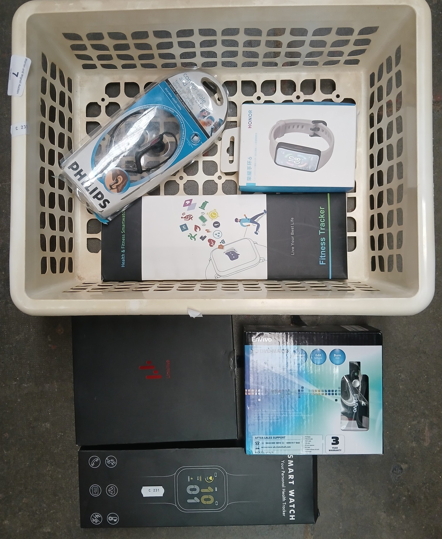 A box of electronics including smart watches and headphones.