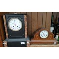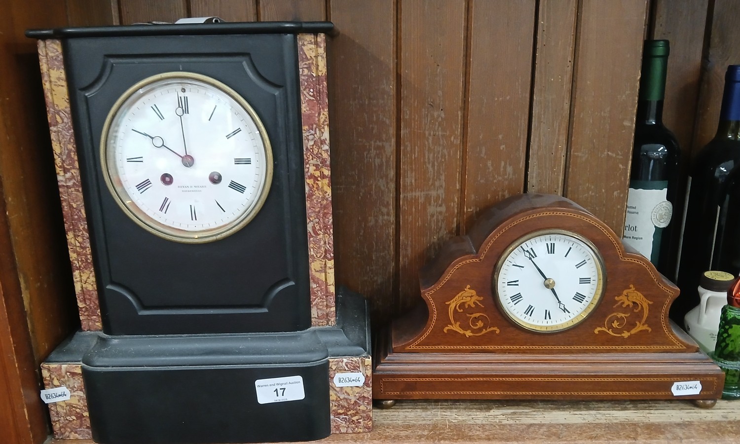 A black slate and marble mantle clock, the dial marked Bevan & Weare, Birkenhead, together with an inlaid mahogany mantle clock.