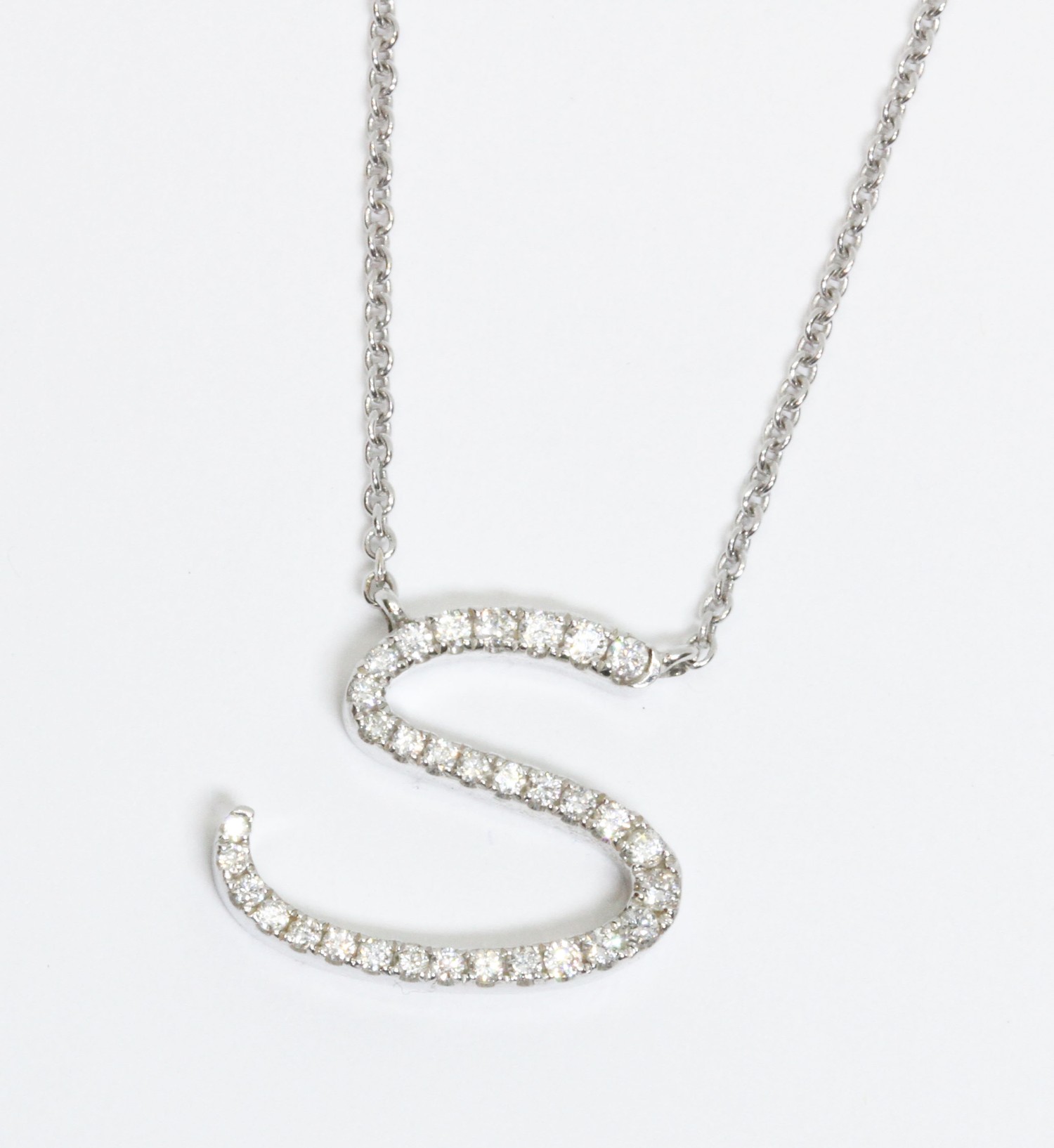 DAVID M ROBINSON, an 18ct white gold diamond pendant necklace, thirty round round brilliant cut diamonds weighing approximately 0.06cts in total, 13mm x 16mm, 44cm trace link chain, hallmarked; sponsor 'DMR', London, gross weight 4.5g.