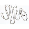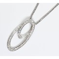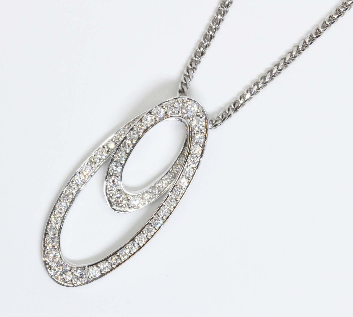 DAVID M ROBINSON, an 18ct white gold diamond pendant of oval/spiral form, pave set round brilliant cut diamonds weighing approximately 0.50cts in total, length 30mm, hallmarked; sponsor 'DMR', Edinburgh, suspended on 44cm snake link marked with 18ct gold import marks, gross weight 10.1g.