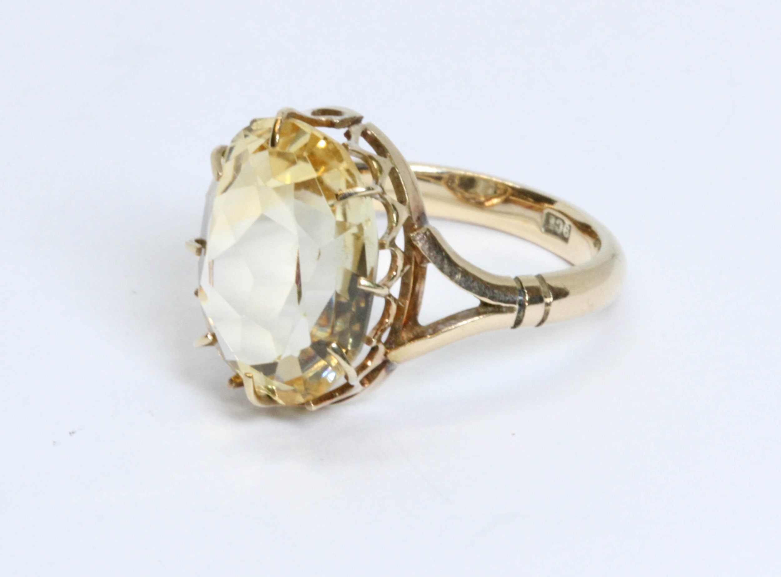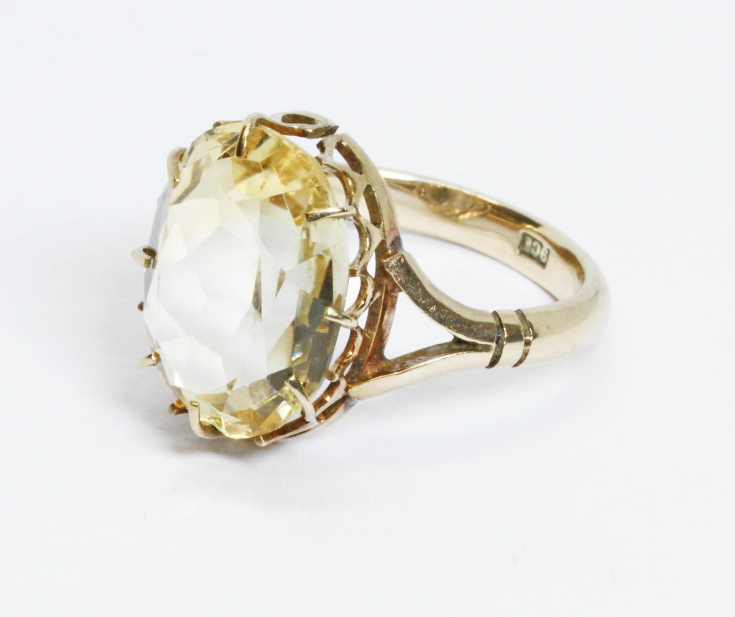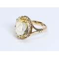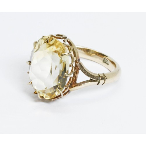 A citrine ring, the oval mixed cut stone weighing approximately 7ct, band marked '9ct', gross weight 4.9g, size O.