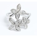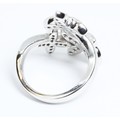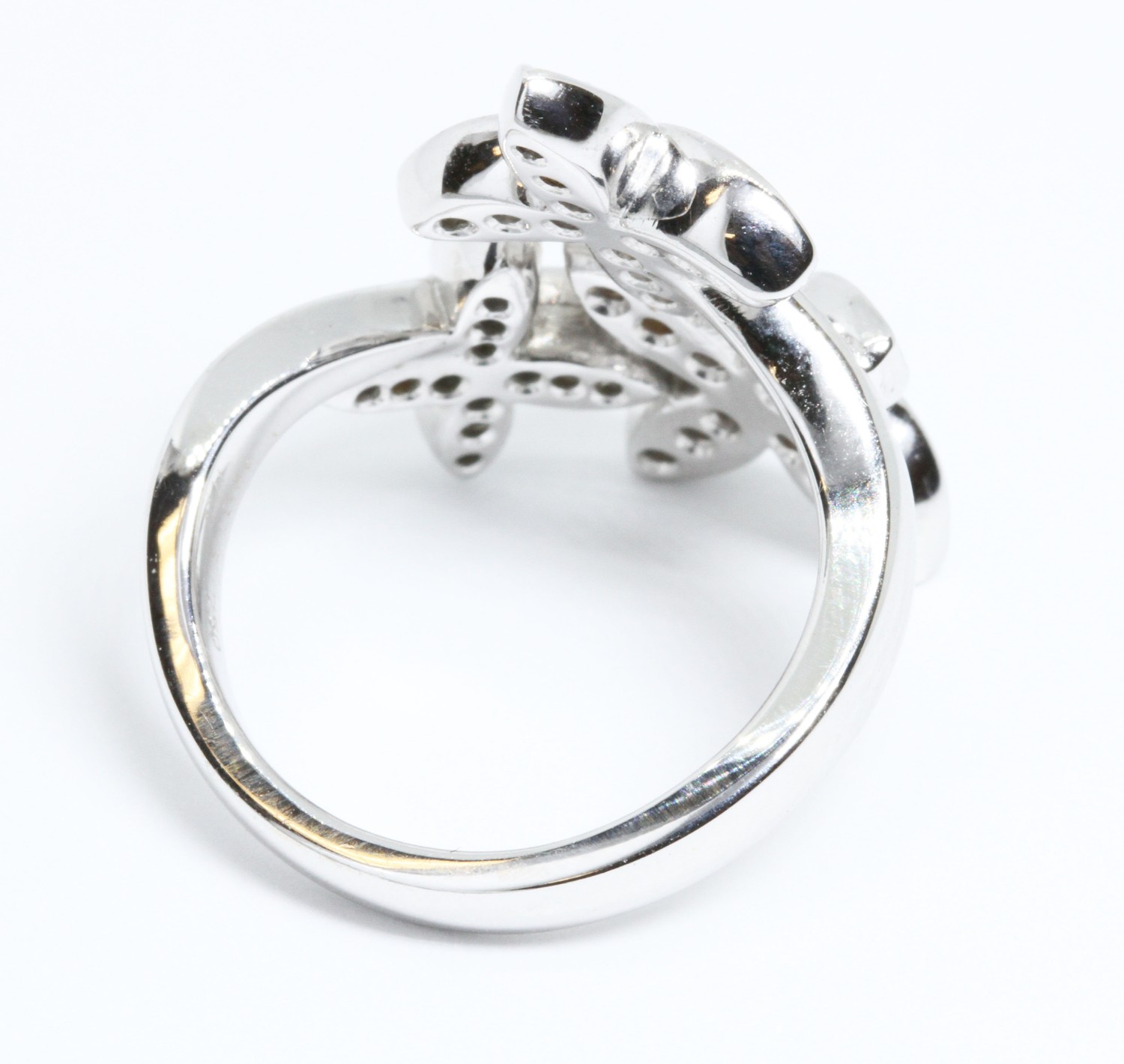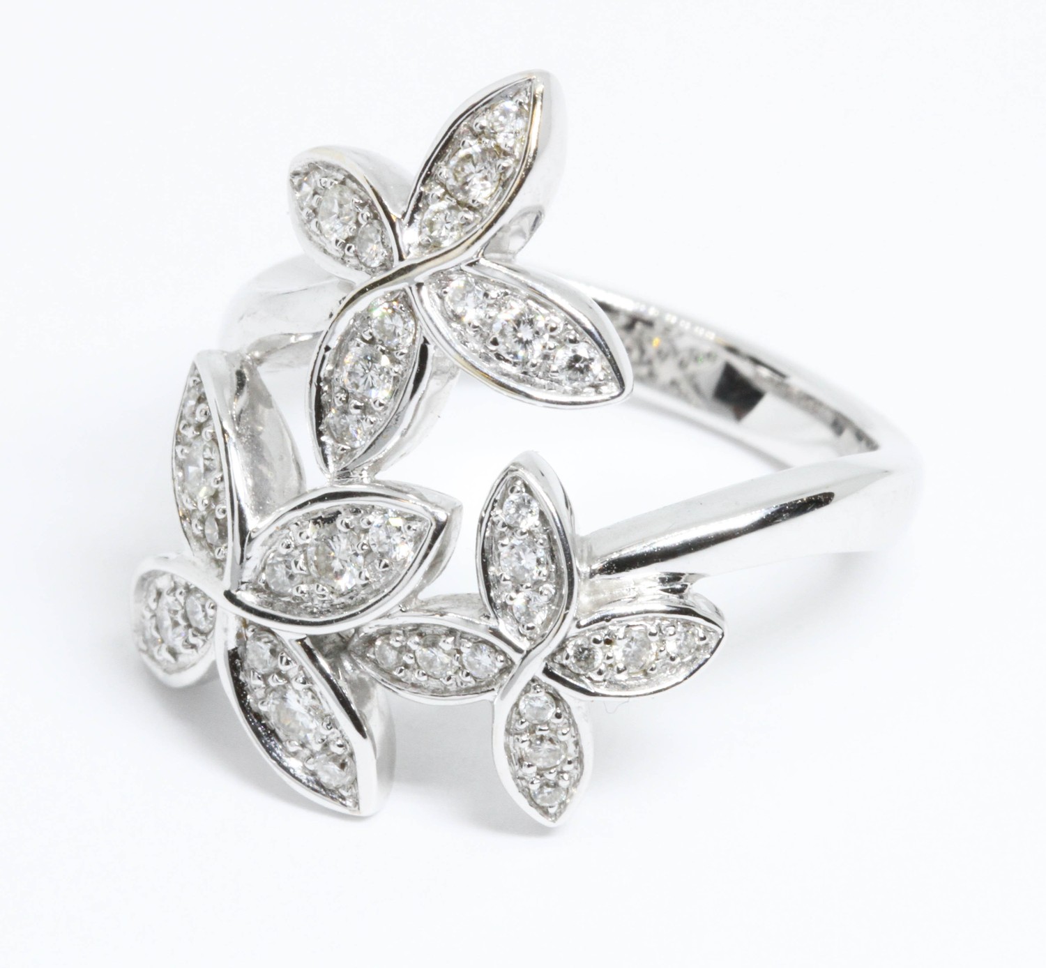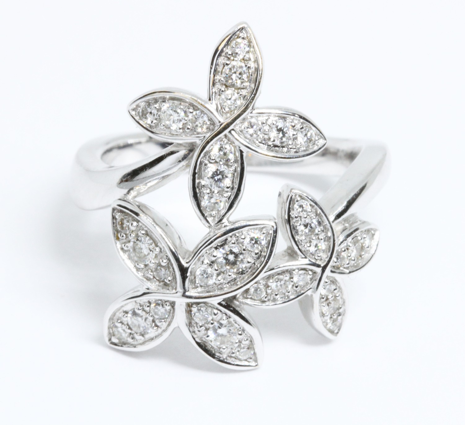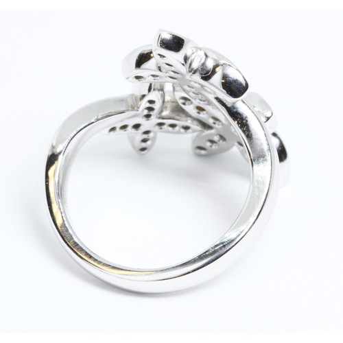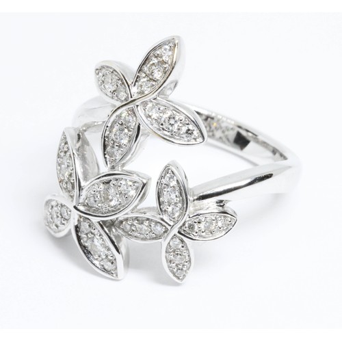 DAVID M ROBINSON, an 18ct white gold diamond cluster ring, three graduated flower clusters set with thirty six round brilliant diamonds weighing approximately 0.45cts in total, colour G/H, clarity VS1/VS2, the cluster measuring approximately 24mm x 19mm, hallmarked; sponsor 'DMR', London, gross weight 9.9g, size L.
