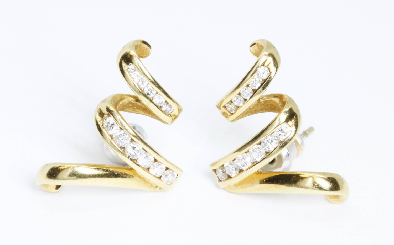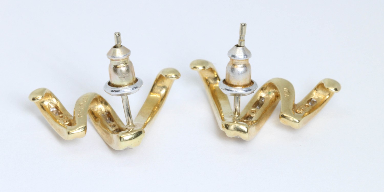 DAVID M ROBINSON, a pair of 18ct gold diamond earrings, trail design with channel set round brilliant cut diamonds weighing approximately 0.15cts in total, length 18mm, hallmarked; sponsor 'DMR', Sheffield 2000, gross weight 3.8g.