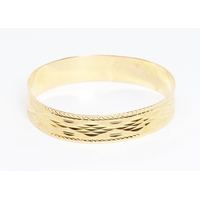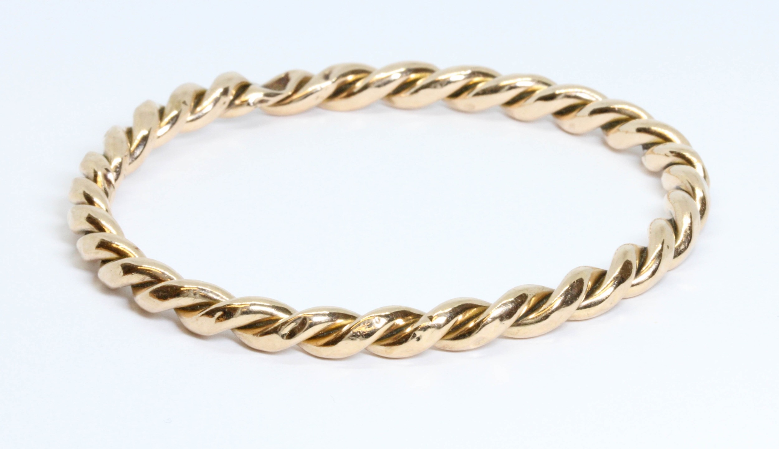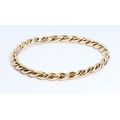 A yellow metal twist bangle, unmarked, diameter 70mm, weight 10.7g.